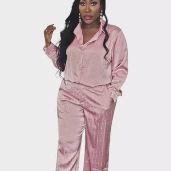 Made of flowy satin with rhinestone pinstripe detail that adds a touch of elegance.