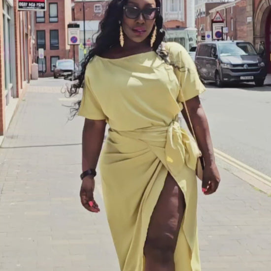 Introducing our stunning Chartreuse wrap dress, the perfect addition to your summer wardrobe for any special occasion.