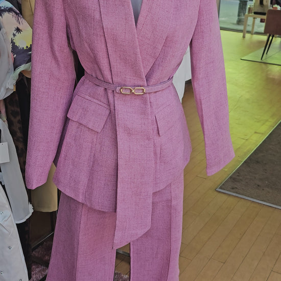 Introducing our Pink Belted Trouser Suit, featuring a stylish asymmetrical detail on the jacket hem.